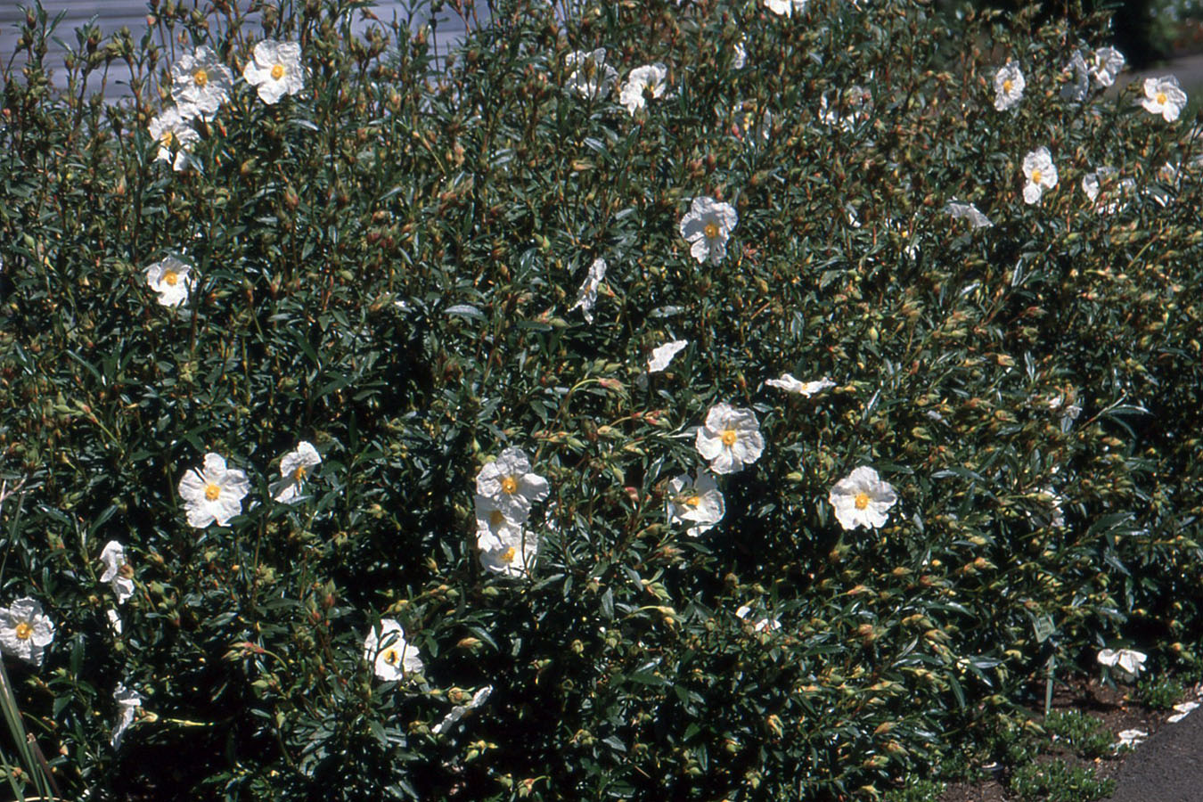 - Evergreen shrub, 5 x 5 ft (1.5 x 1.5 m) tall and wide, upright. Leaves, opposite, simple, oblong-lanceolate, 3-10 cm long, aromatic (pine fragrance), gray-green, pubescent below. Flowers large white, to 7 cm, yellow center, basal yellow spot on each petal, blooms in spring/early summer.